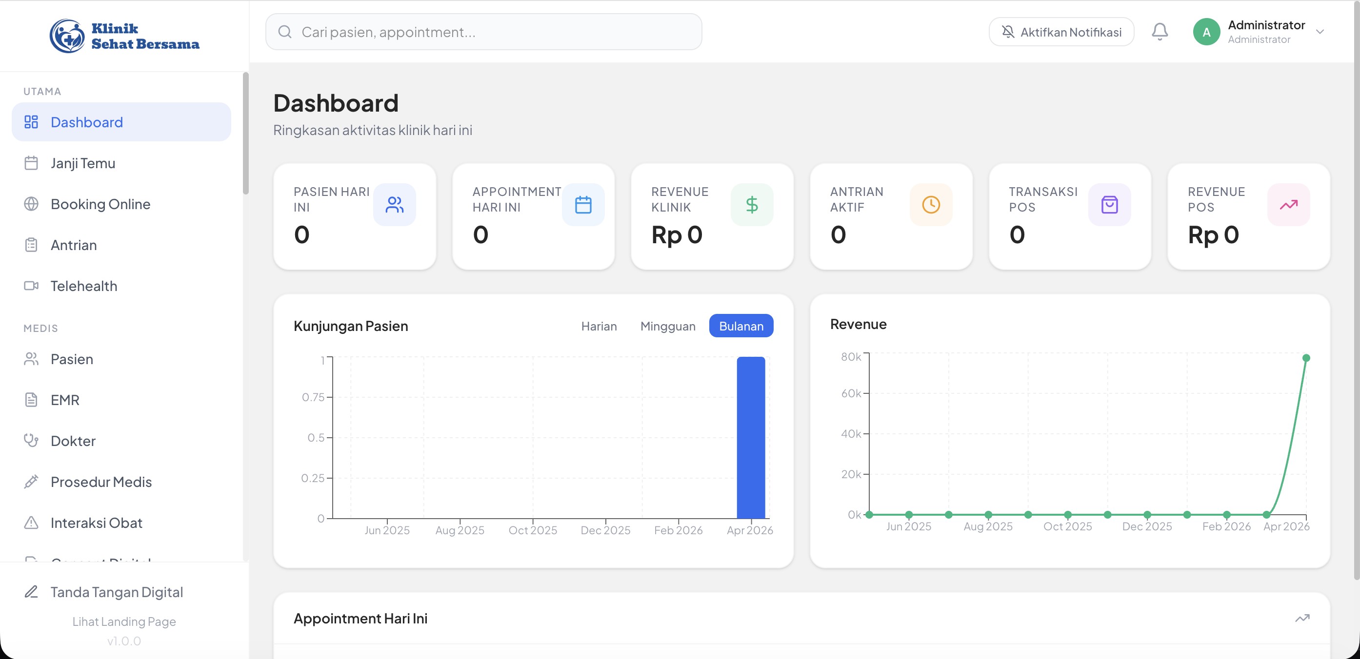 Kunjungi ProyekSistem Manajemen Klinik adalah aplikasi berbasis web yang dirancang untuk mengelola operasional klinik secara menyeluruh—mulai dari pelayanan pasien hingga laporan keuangan. Sistem ini mengintegrasikan rekam medis elektronik (EMR), manajemen dokter, farmasi, kasir (POS), hingga analitik bisnis dalam satu platform yang efisien dan mudah digunakan.