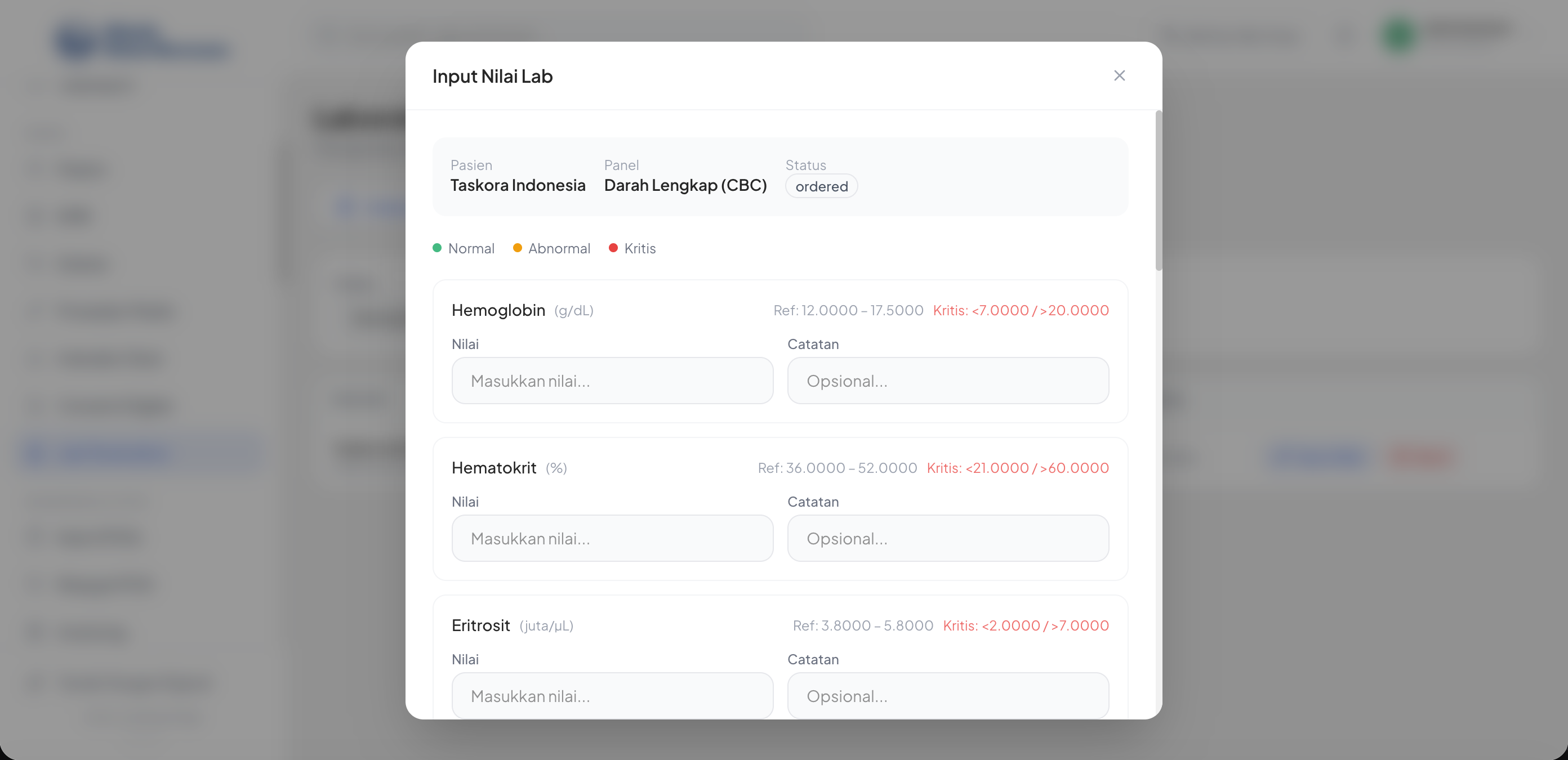 - Laboratorium: Input hasil lab dengan indikator normal/kritis