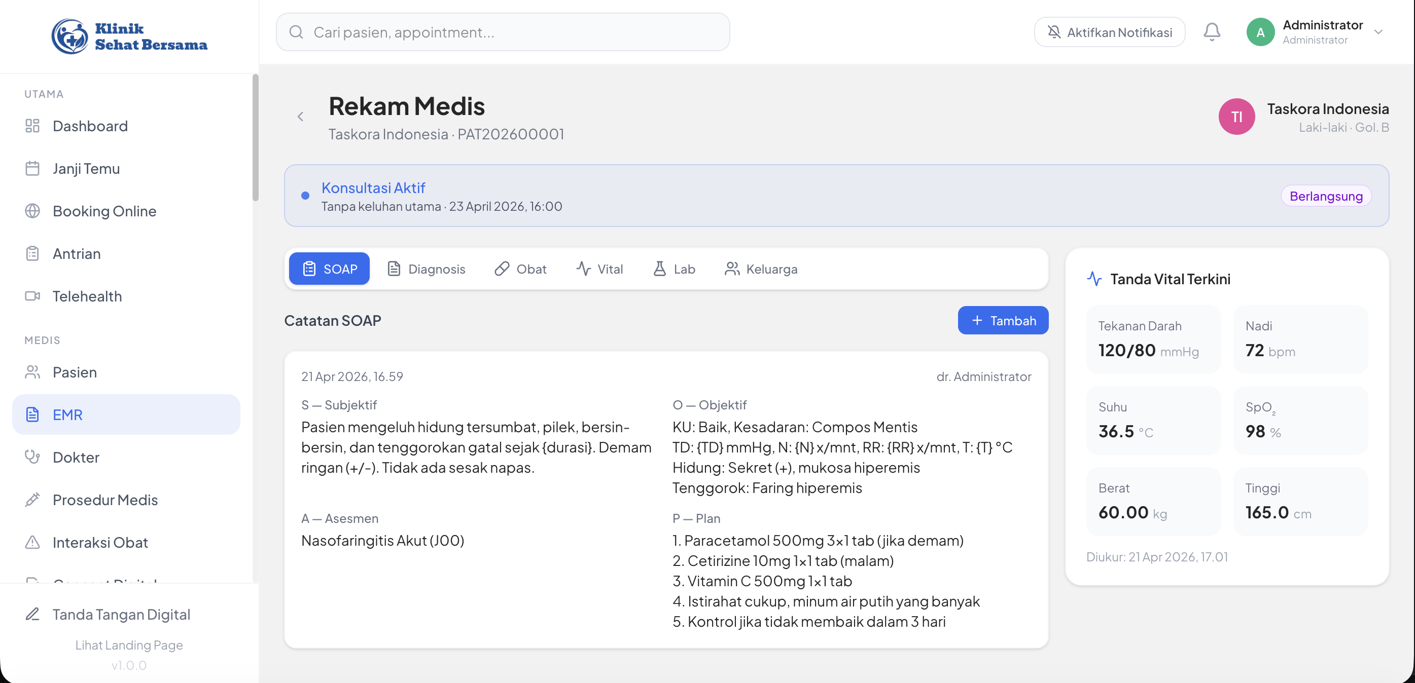 - EMR (Rekam Medis Digital): Pencatatan SOAP, riwayat pasien, dan data vital