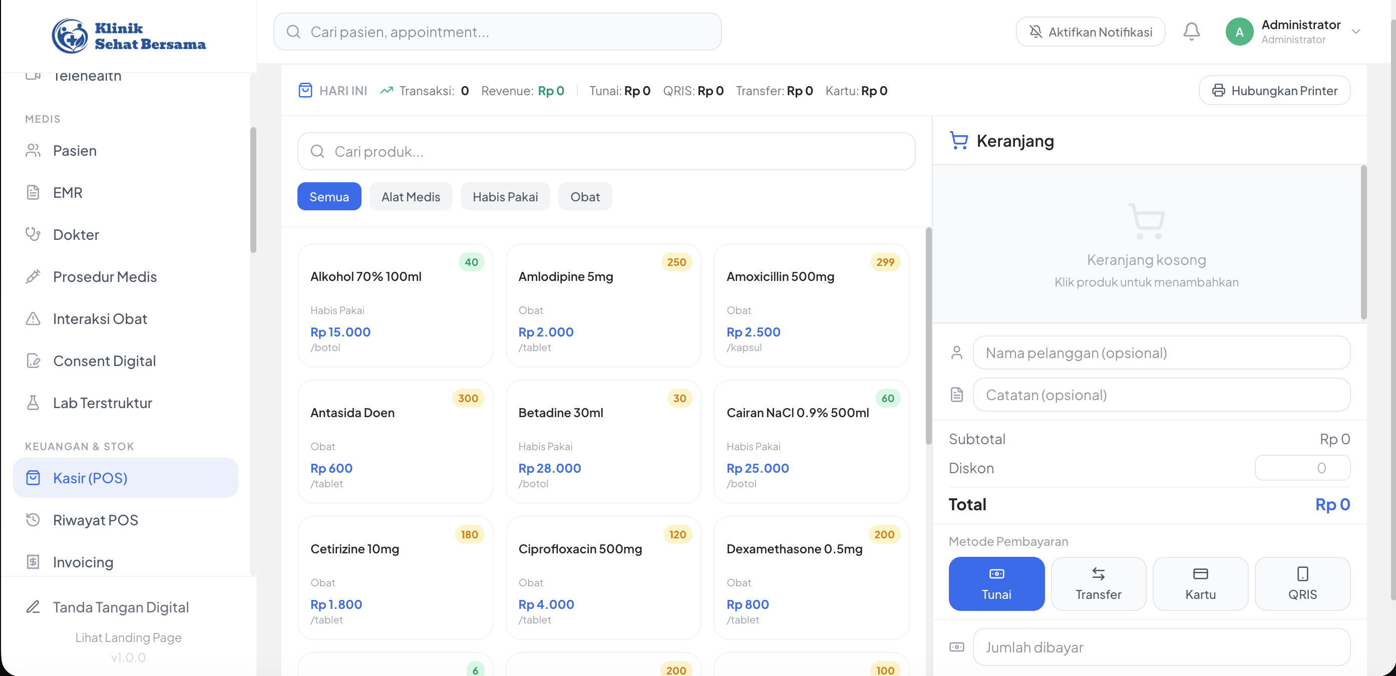 - Kasir (POS): Penjualan obat & multi metode pembayaran