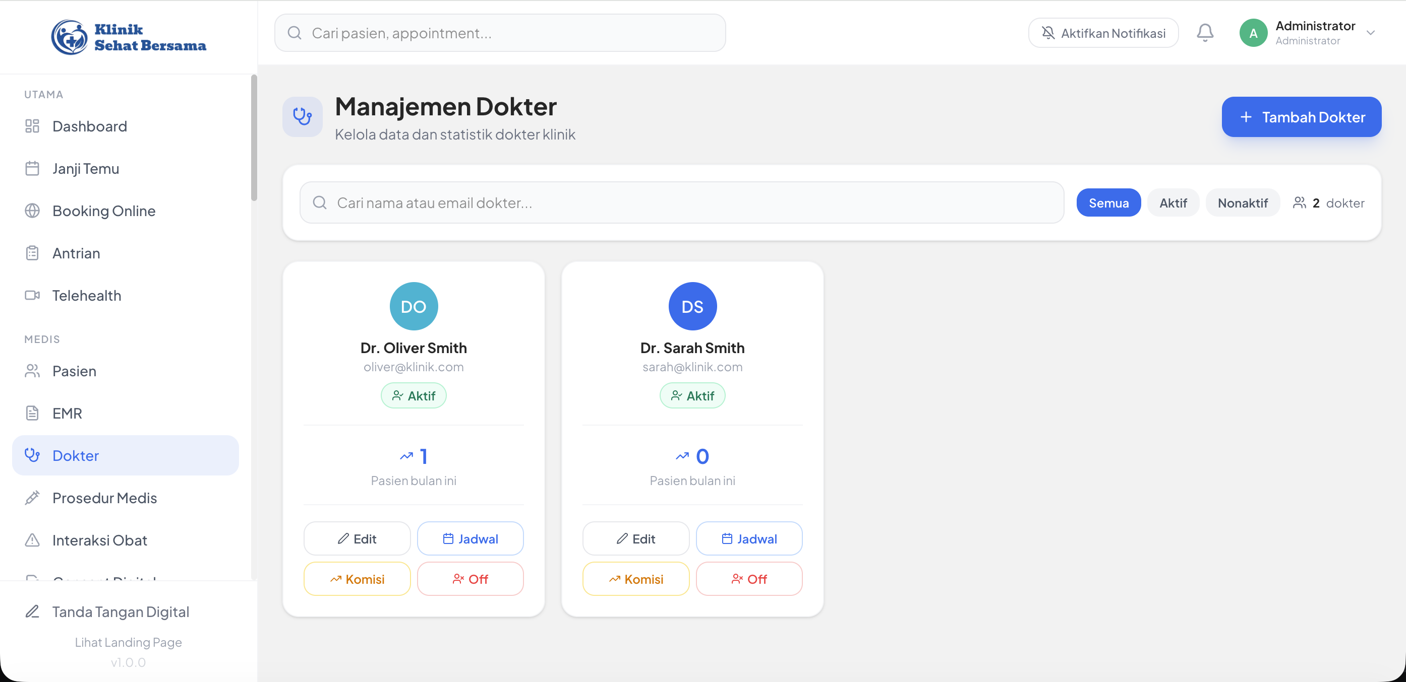 - Manajemen Dokter: Jadwal praktik, performa, dan komisi