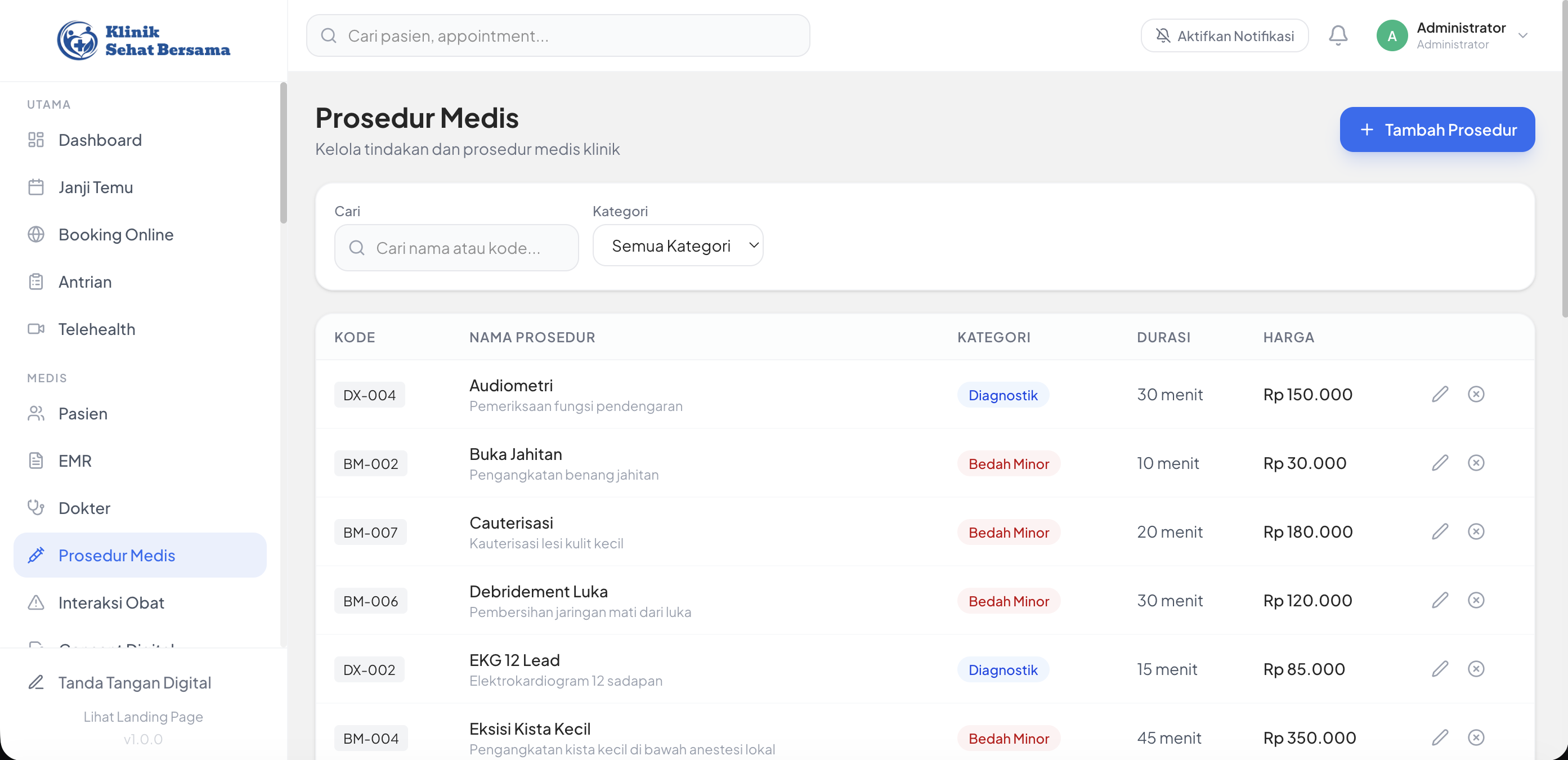 - Prosedur Medis: Data tindakan, kategori, durasi, dan harga